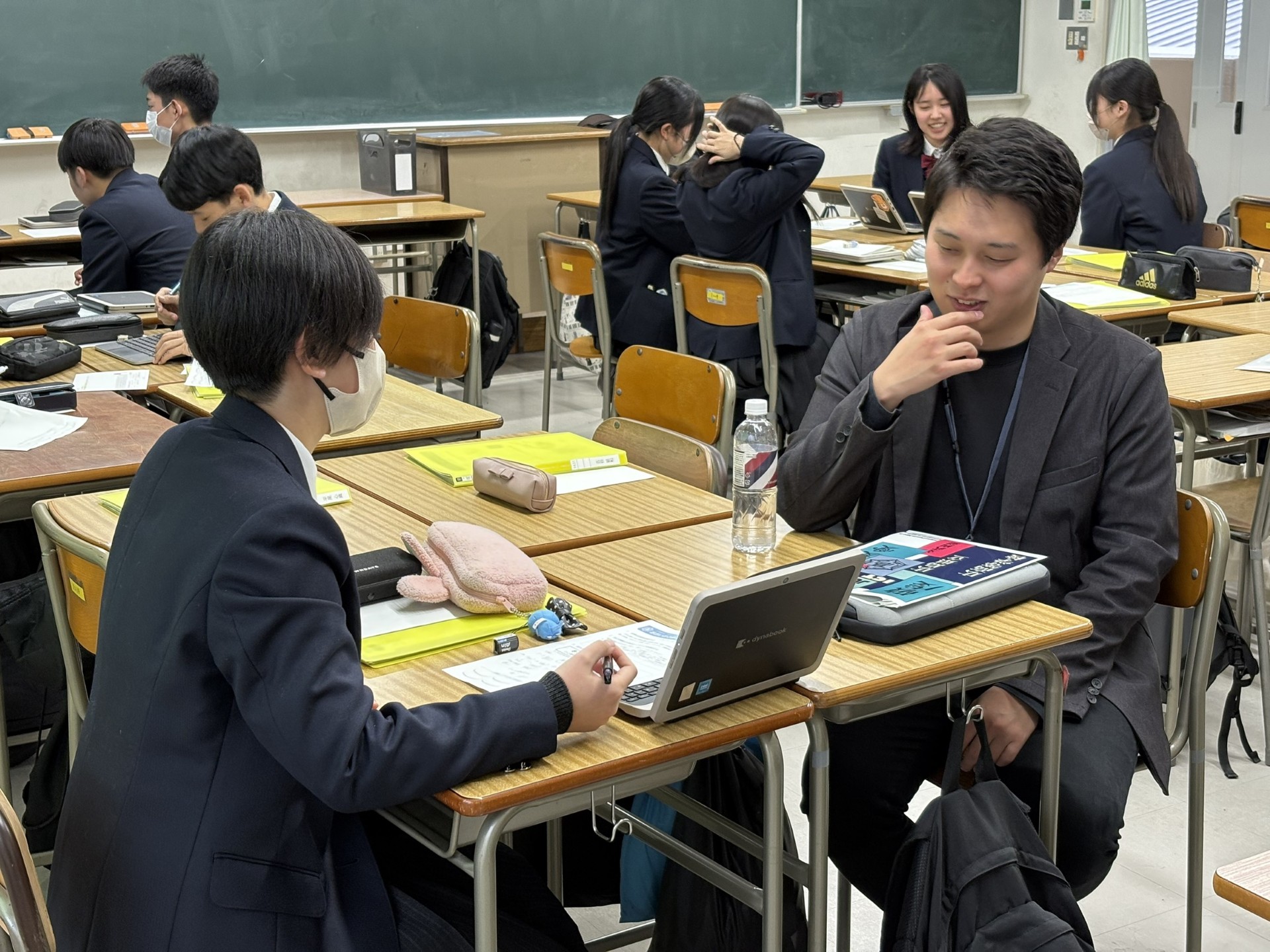 最初は「大学院生の人に発表するなんて緊張する…」といった表情の生徒さんも多かったのですが、いざ発表が始まると雰囲気は一変。「このテーマ、もっと深めるにはどうしたらいいですか?」「先行研究ってどう探せばいいですか?」 と、終了間際まで質問が止まらないほどの盛り上がりを見せました。授業の終わりには、多くの生徒さんが「探究のコツ」のようなものを掴んだキラキラした表情になっていたのが印象的でした。放課後になっても私たちへ熱心に相談を続けてくれる生徒さんもいて、私たち自身も初心にかえるような刺激的な時間となりました。