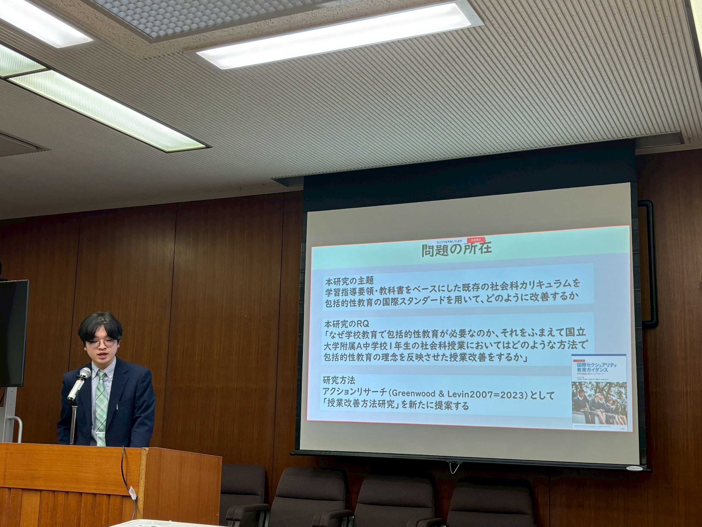 社会認識教育学と地理学の分野から、修了予定者が修士論文の研究成果を20分で発表し、その後5分間の質疑応答が行われました。発表者からは多様なテーマの発表が行われ,質疑応答では本コースの教員や他領域の副指導教員から、多くのやり取りが交わされ、発表者は真摯に応えていました。