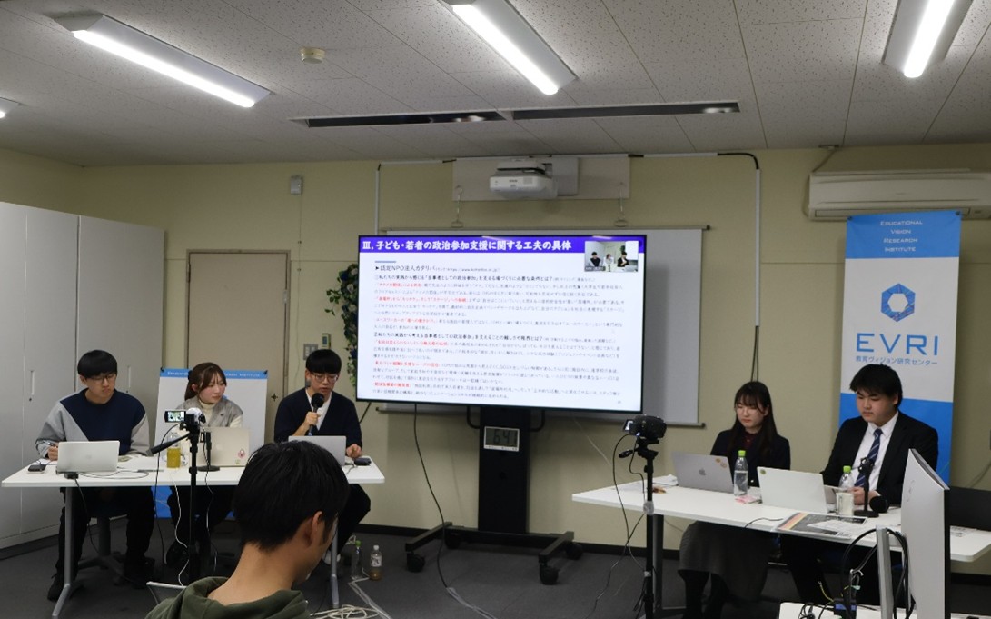 3月4日には、EVRI定例オンラインセミナー講演会No.197「子ども・若者の「当事者としての政治参加」を支えるには――支援に携わる同世代の語りを手がかりに――」を開催しました。本セミナーでは、井戸(筆者)と川口准教授が司会として登壇し、日本で子ども・若者の政治参加を支援する当事者世代の語りを聞き、日本の文脈特有の課題とそれを乗り越えるための工夫を共有した上で、今後必要となる支援の在り方を議論しました。